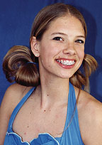 We turn her into a beautiful blond angel. Her hair was blunt-cut just below her shoulders and parted down the center to "show off" her playful smile. Then we simply set it in hot benders, cooled it, and finger-tossed it for a "curly and cute" coif. Charlotte loves butterflies, so we added butterfly clips to keep her hair from falling into her face. |