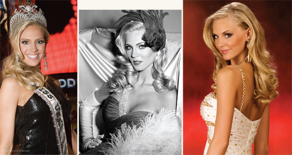 Current Miss Teen USA Stevi Perry and Miss Universe Dayana Mendoza were interrupted from Tweeting about the night’s results to present the special awards. Stevi presented the “Congeniality Award” to an unsuspecting and teary-eyed Cynthia Pate of Wyoming. Dayana, the latest in a string of goddess-like beauties from Venezuela, presented the “Photogenic” prize to a surprised Jessi Pierson of West Virginia. |